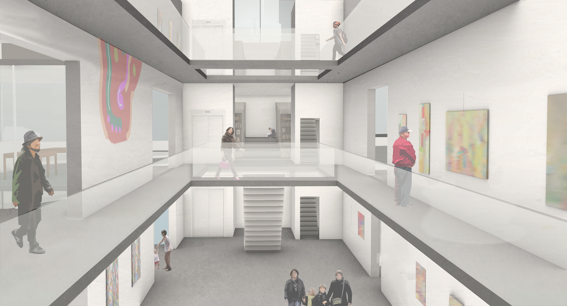 Atrium Perspective: a view into the spine / art gallery with glimpses into the glass volumes beyond