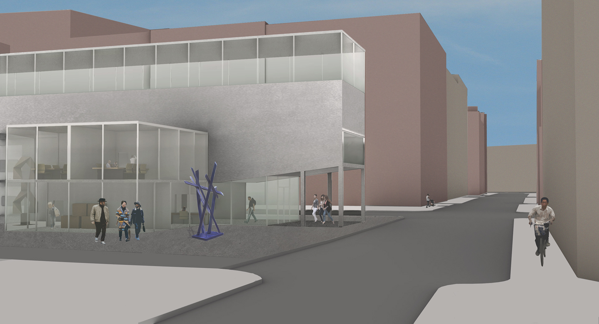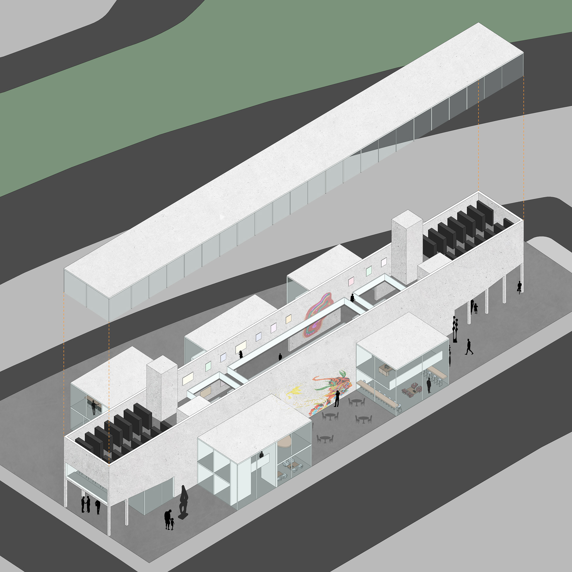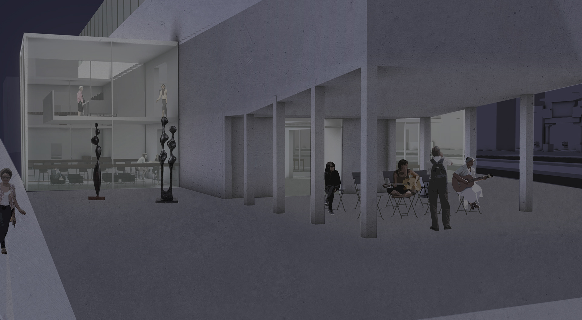 Finally, in order to make the spine feel less monolithic, I carved out public spaces from either end. At the entry, the auditorium above informs the slope and welcomes passersby onto the site. I mirrored this sloping condition on the other side and created a covered outdoor space meant for impromptu music performances or art installations.