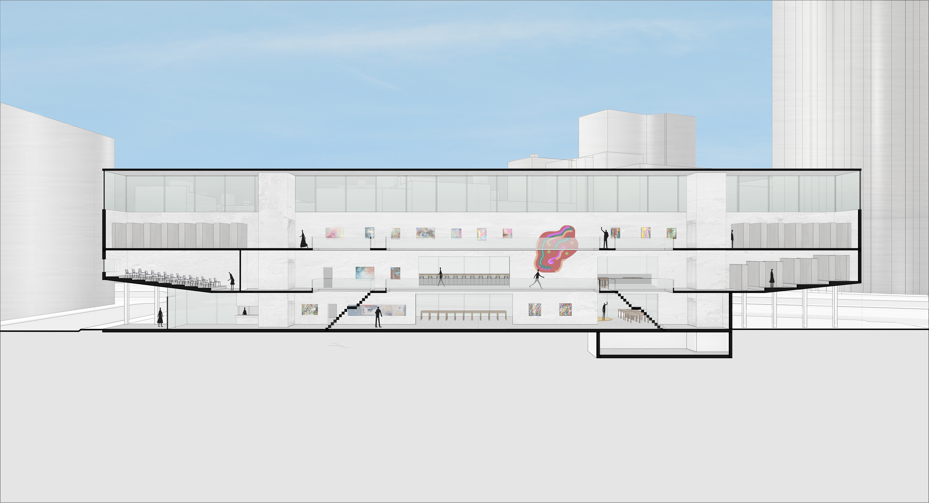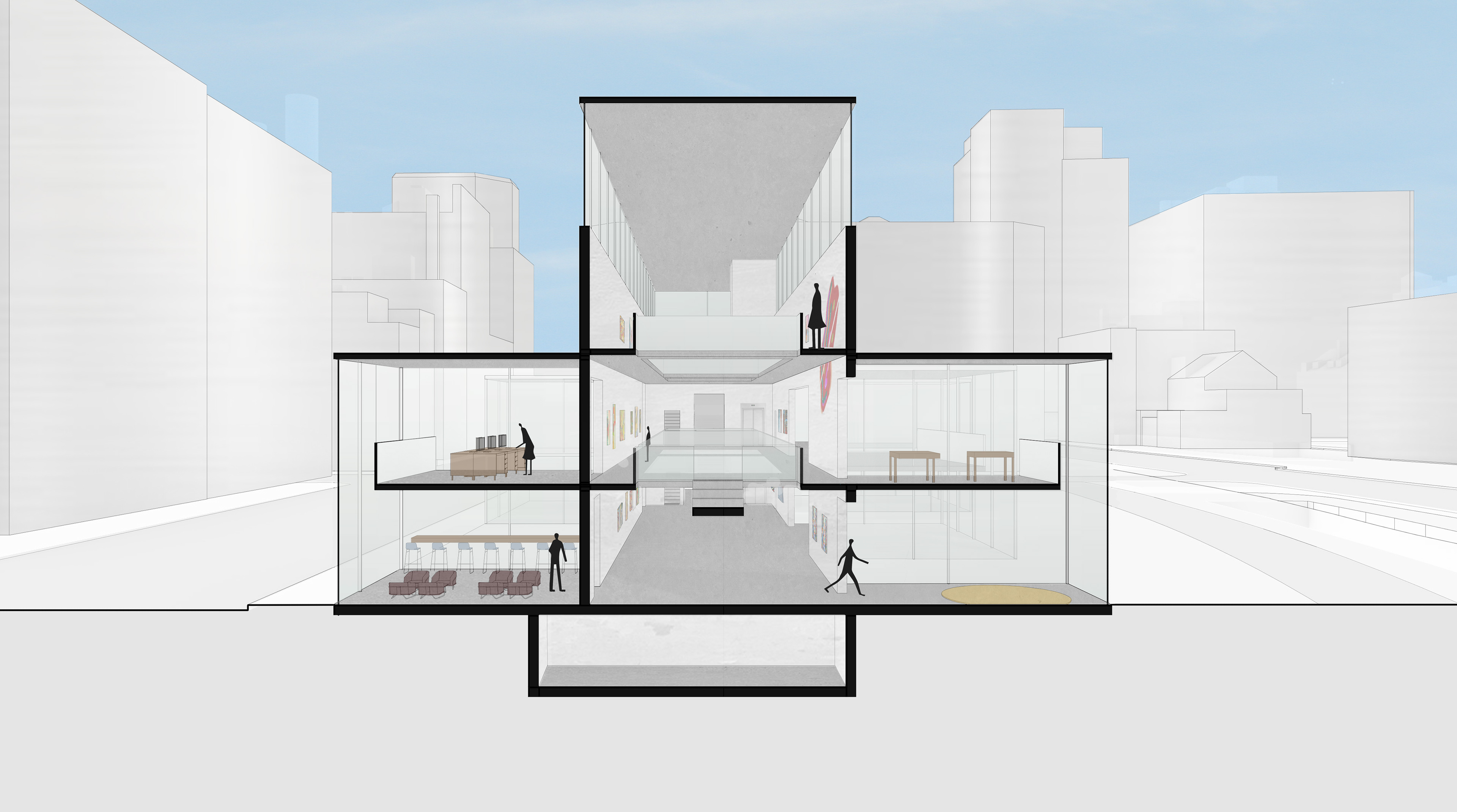 Longitudinal Section: provides a glimpse into the atrium condition of the spine and how art might occupy the walls