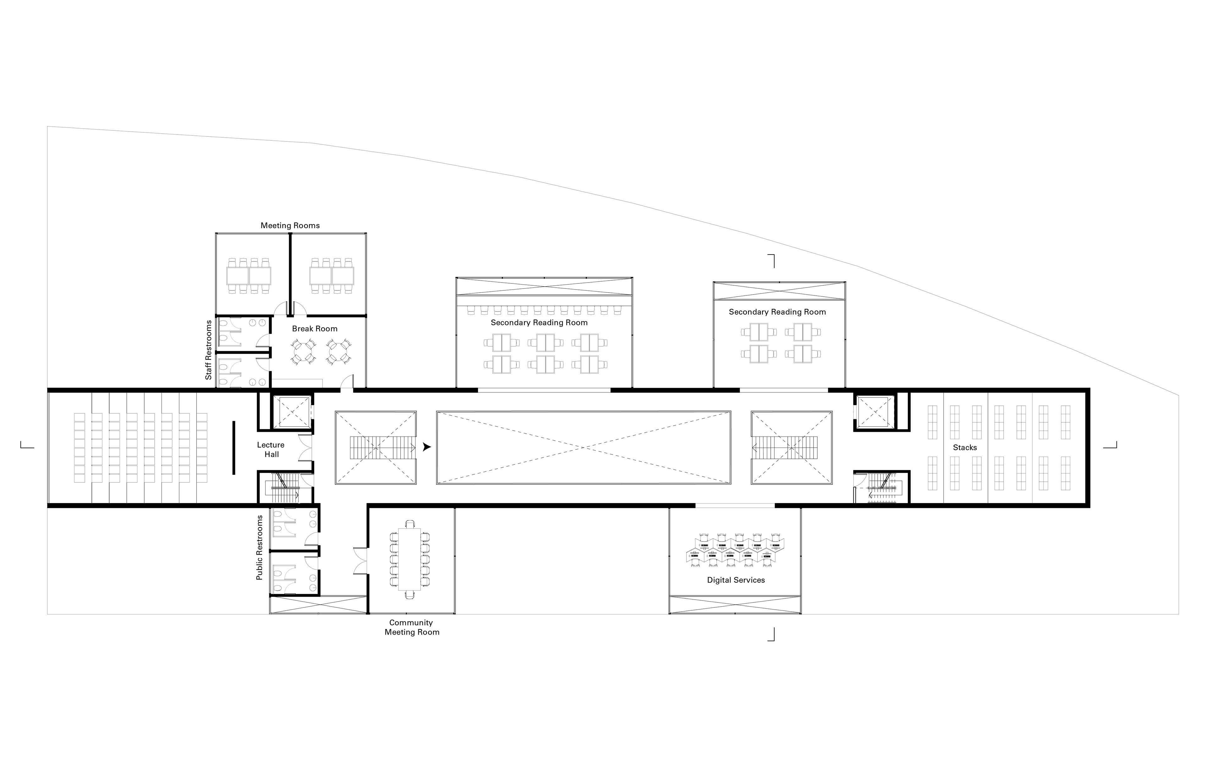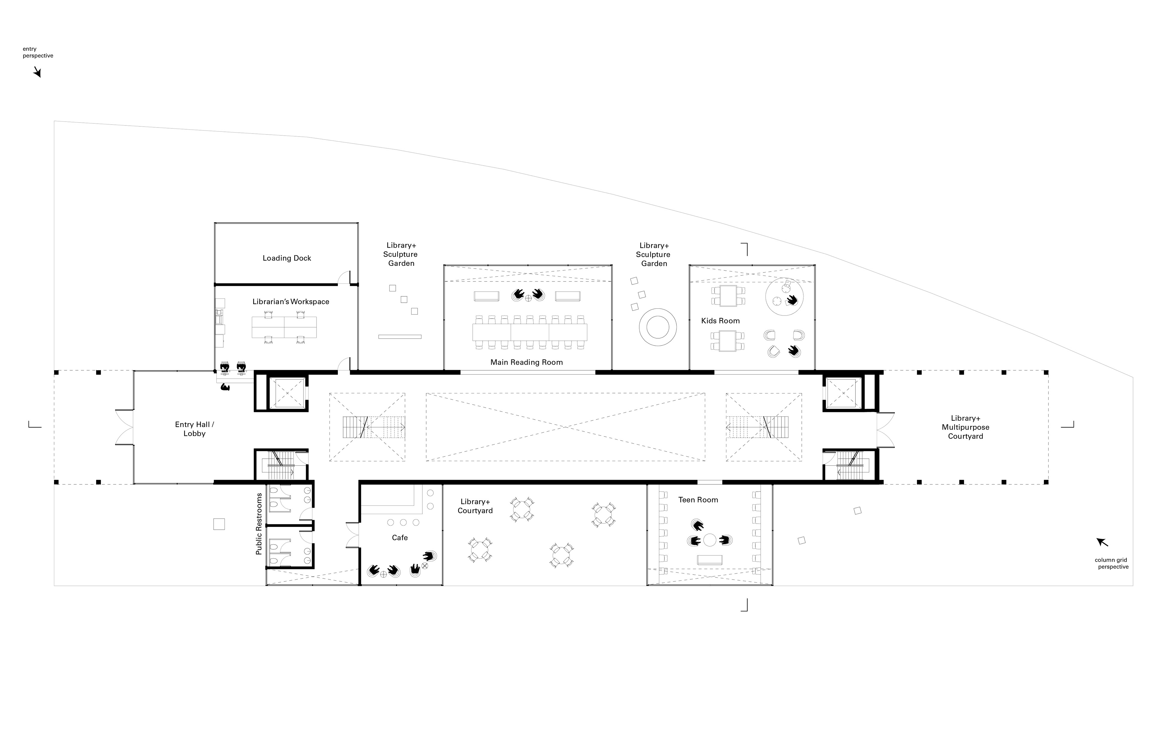 My library proposal originated as a continued exploration of the ambiguity between circulation space and event space, an idea previously studied in my Chinatown Pavilion design. From that project, I adopted the idea of a central circulation space that also served a programmatic purpose: in this case, the central circulation spine of my library also contains the stacks and an art gallery space. Event spaces protrude from each side of the spine and are grouped together my programmatic function, allowing for ease of circulation through and within the spine.