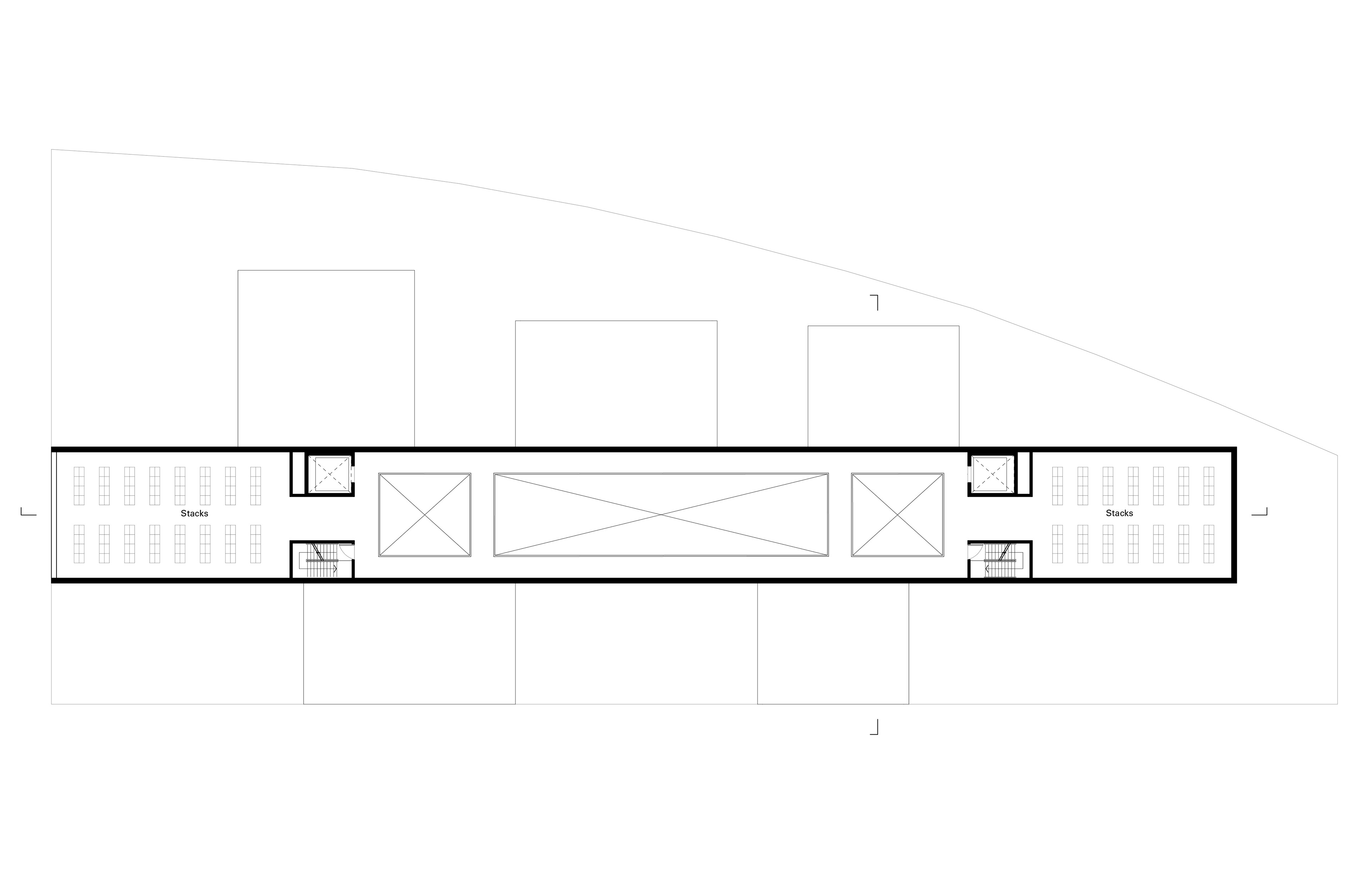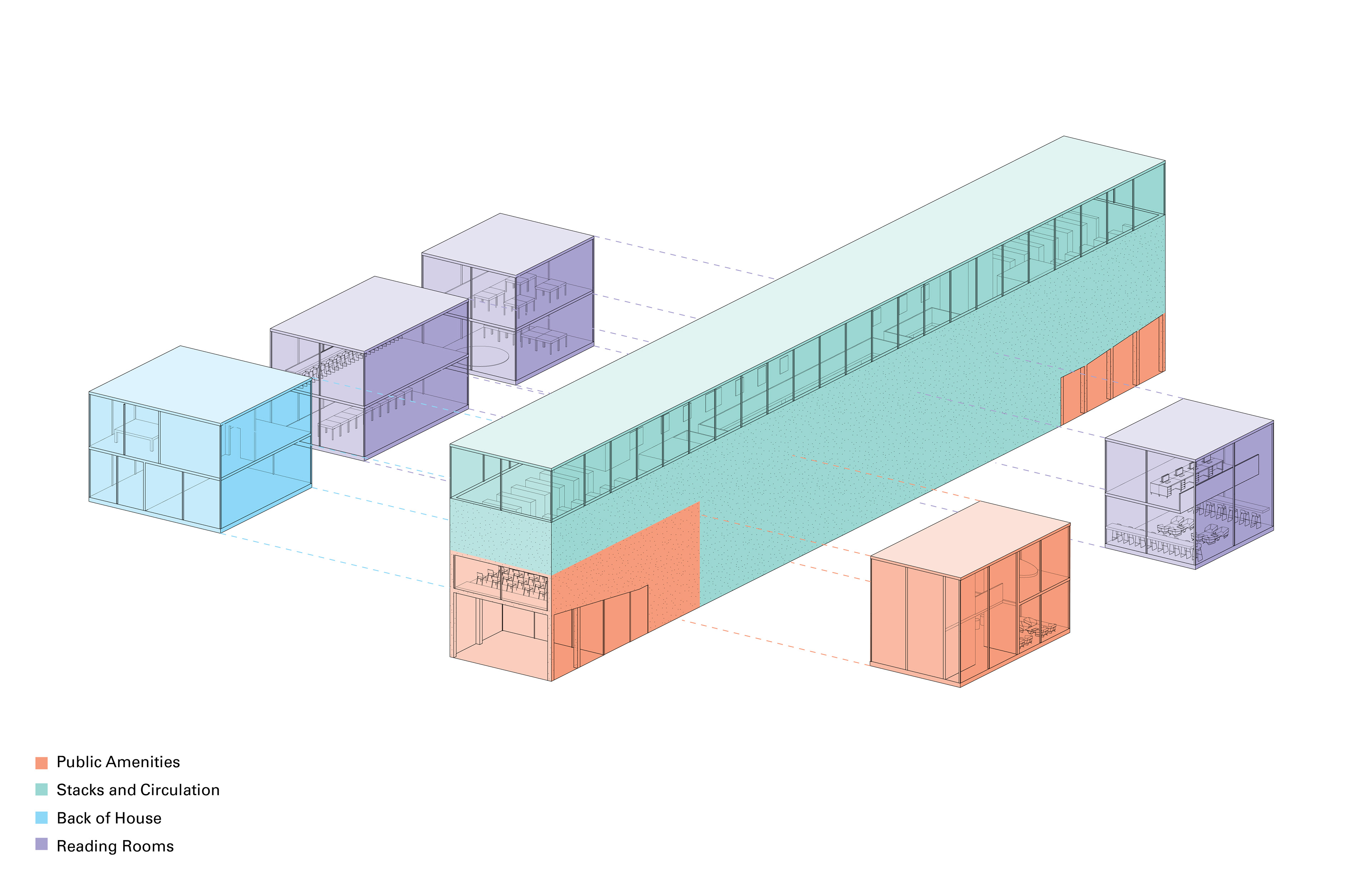Program Diagram: the central spine houses stacks and circulation, while all other programmatic functions are in the protruding volumes