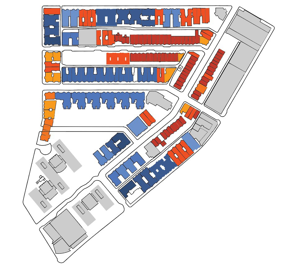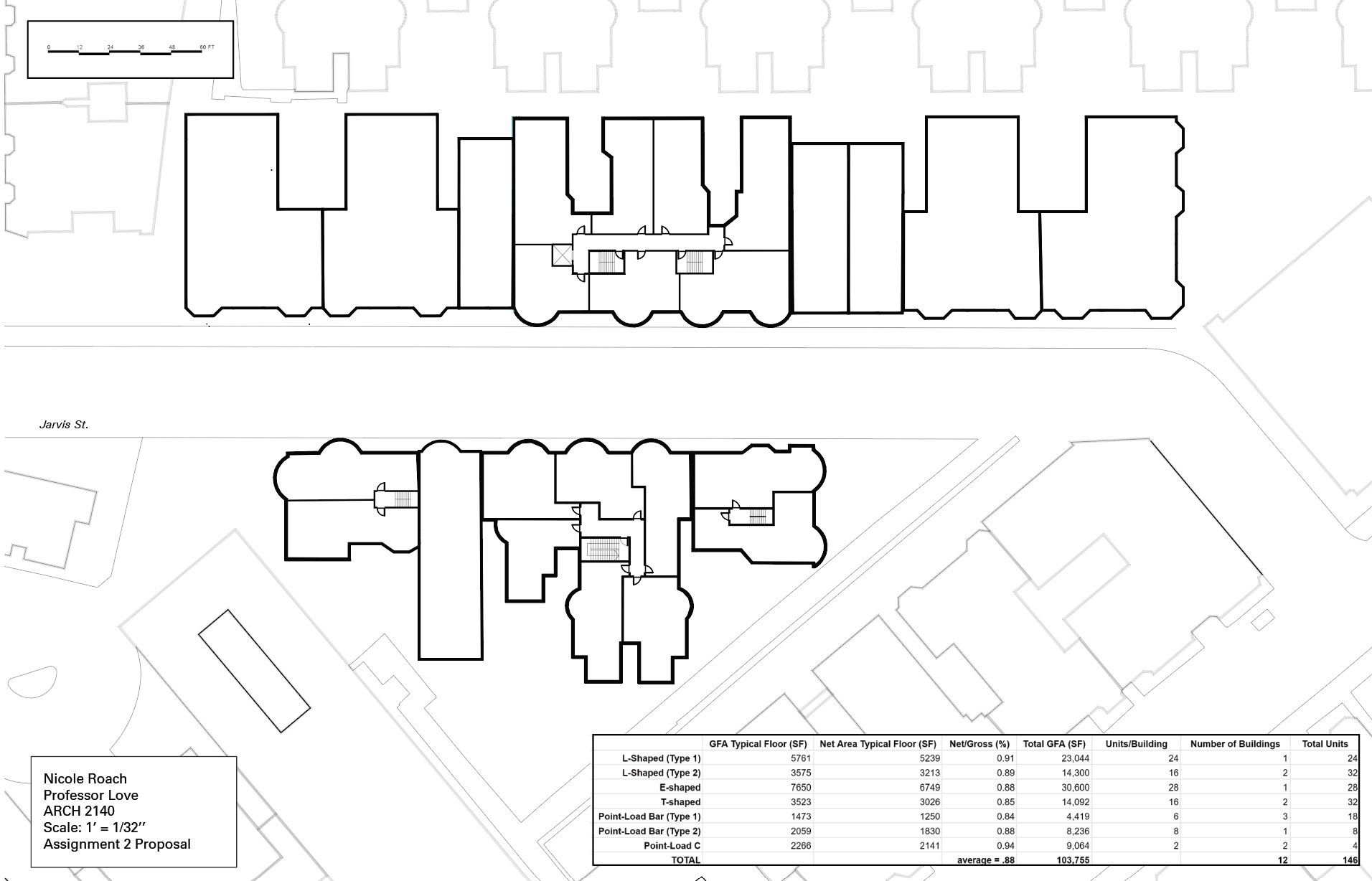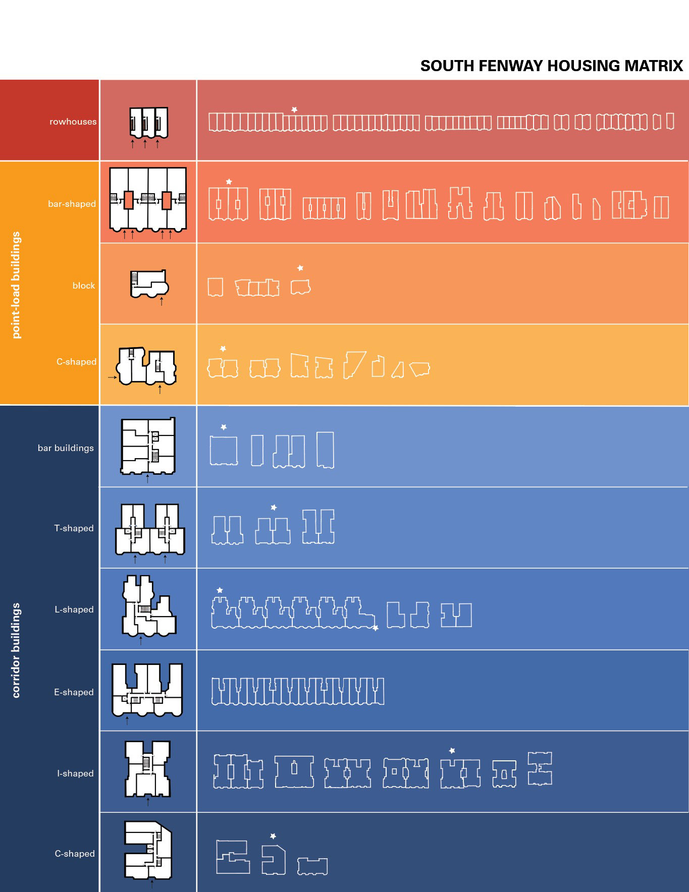 In order to get students acquainted with Boston's housing types, students were tasked with creating a housing matrix that identifies. Students sorted dozens of buildings from the Fenway area into similar apartment types after making educated guesses about floor plans using google maps--elevator bump-outs and stair skylights were helpful indicators as to what occurred within each building.